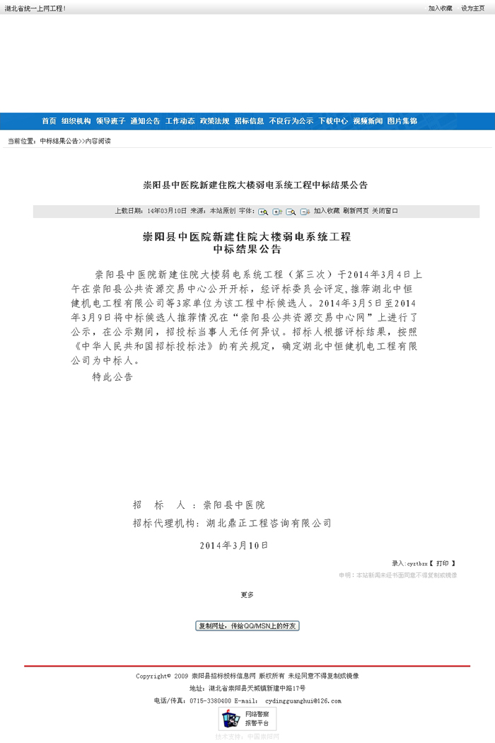 崇陽縣中醫院新建住院大樓弱電系統工程中標結果公告
