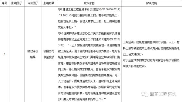 在控制最嚴(yán)的1-2月,全國大部分項(xiàng)目處于停工狀態(tài),即便通過后期補(bǔ)救措施適當(dāng)?shù)刳s工,但停工停業(yè)等行政命令在一定時(shí)期內(nèi)造成工期的延誤是必然的,也將影響政府方對(duì)PPP項(xiàng)目建設(shè)期績效評(píng)價(jià)的評(píng)分。